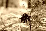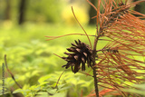A pine cone on an autumn branch of a coniferous tree.
