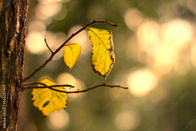 Autumn leaves on a tree branch.