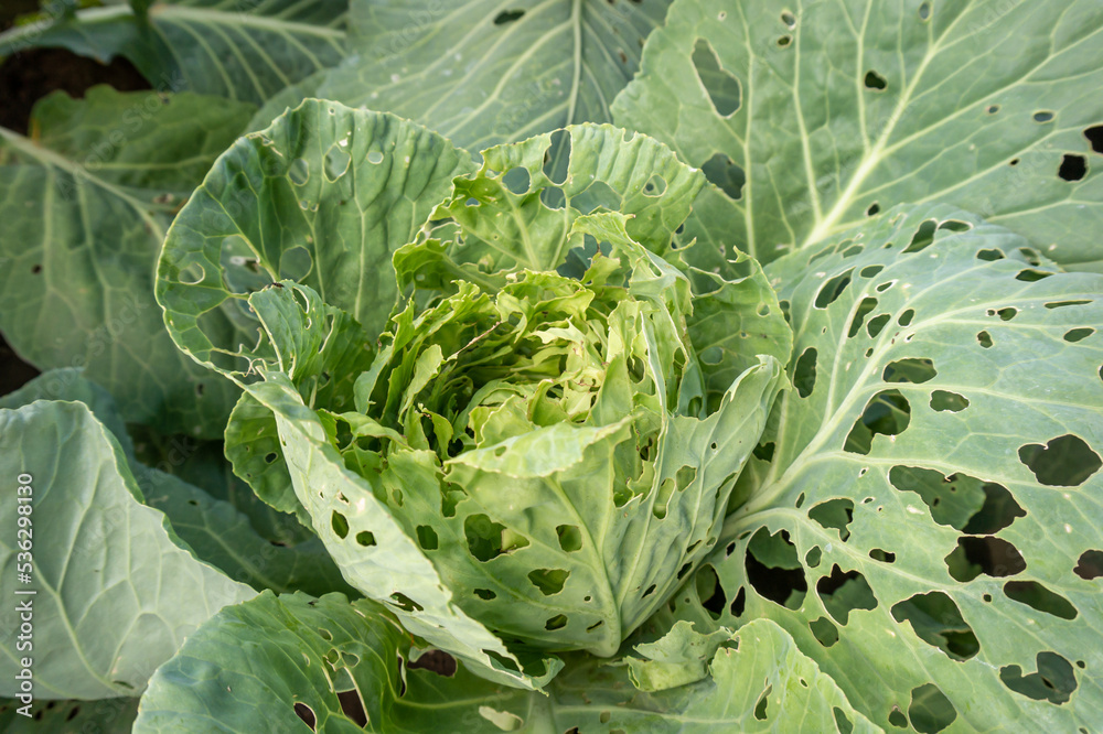 Cabbage eaten by caterpillars in the garden close-up. Damaged white cabbage leaves in holes.