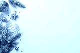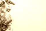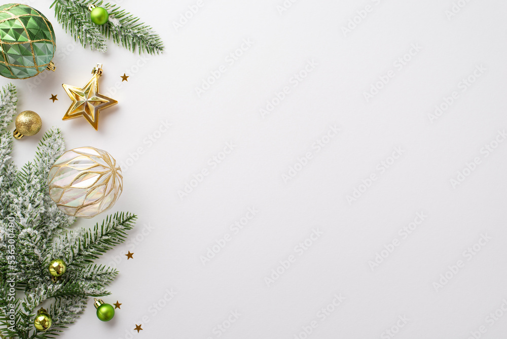 Christmas decorations concept. Top view photo of gold and green baubles transparent ball star ornament confetti and pine branches in snow on isolated white background with empty space