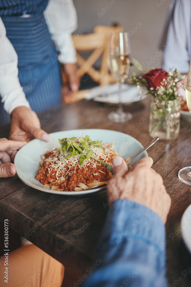 Food, restaurant and hands with a couple and waitress serving a pasta in a fine dining establishment. Date, romance and together with a senior man and woman enjoying eating on their anniversary