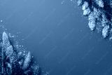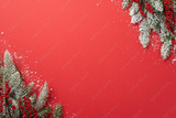 Christmas Day concept. Top view photo of pine branches in snow and mistletoe berries on isolated red background with copyspace