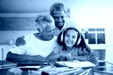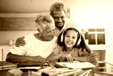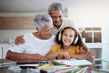 Girl portrait, grandparents home school and education for creative fun, learning and studying in family house. Smile seniors teaching happy child knowledge, creativity and development with headphones