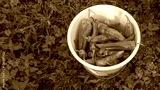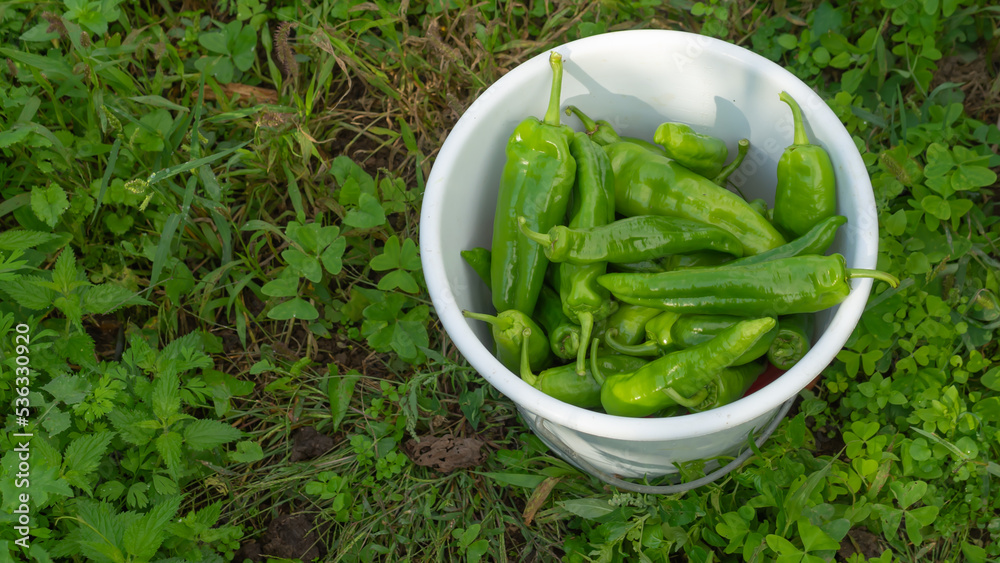 white basket with green peppers in a vegetable garden