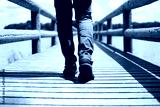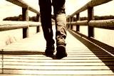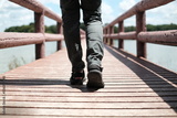 Close up of Traveller walk alone into a wood bridge. Concept of relaxation amoung nature, A Freedom Leisure and Lifestyle and A journey vacation.