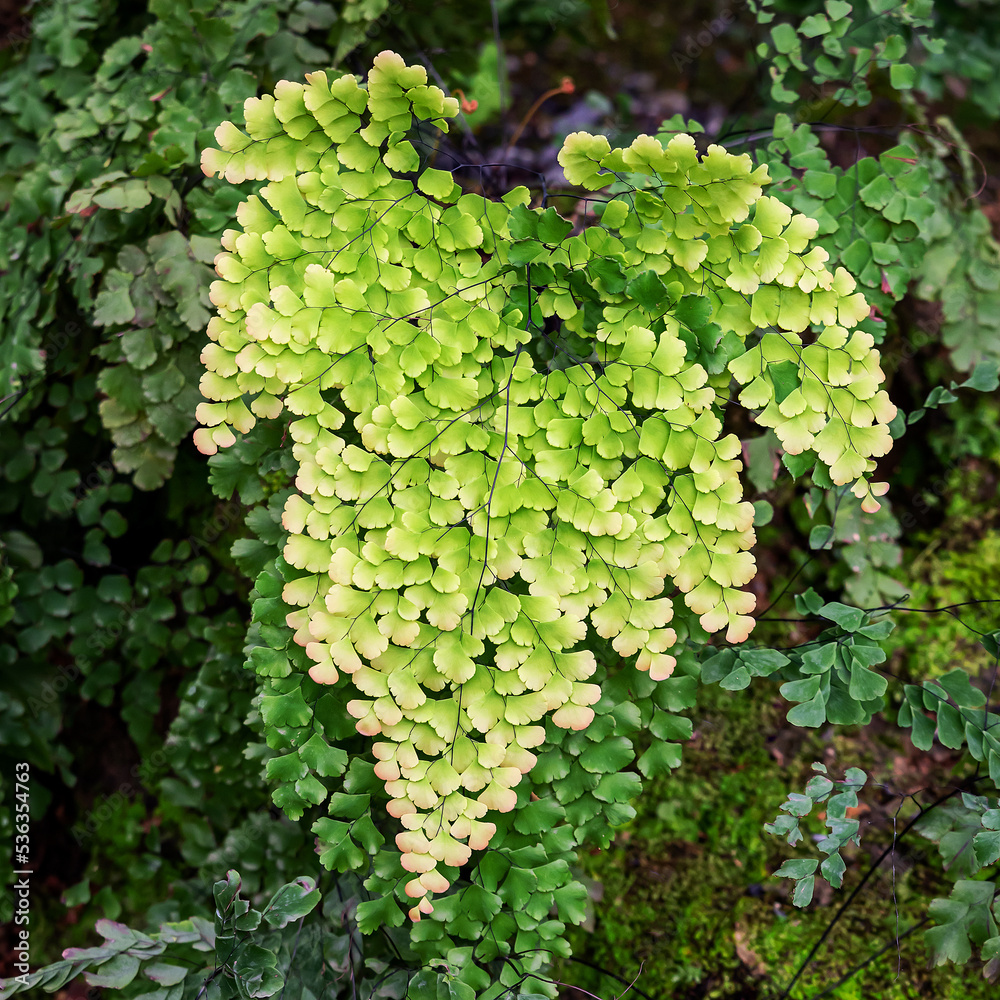 The genus Adiantum is a Maidenhair Fern. The genus name Adiantum comes from the Greek Adiantos, meaning not wet, not wet. It got its name from the fern. Some of the black stalks are not wet even when