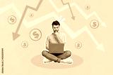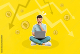 Collage 3d image of pinup pop retro sketch of depressed nervous young guy businessman working netbook arrows down golden coins bankruptcy