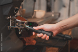 Close up of a hand holding a filter holder with ground coffee in a Cafe or coffee shop. A professional barista. Concept of modern warm coffee shop and Preparing process of coffee.