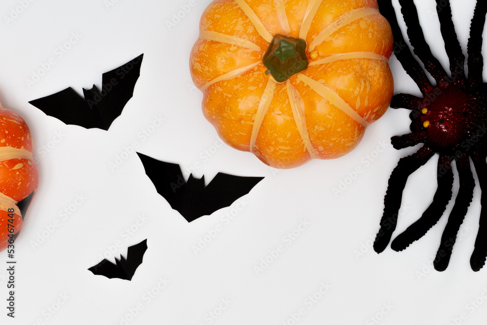 Halloween decorations concept, Scary smiling pumpkin and spider with silhouette of flying black bat