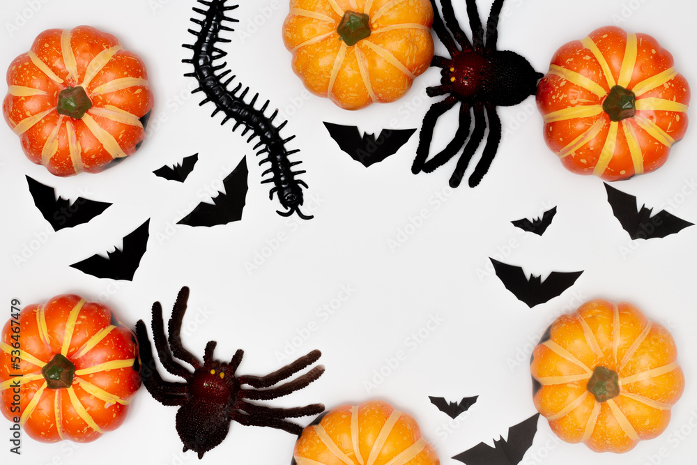 Halloween decorations concept, Scary smile pumpkin with centipede and spider with flying black bat