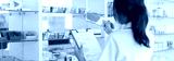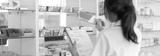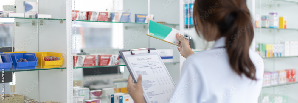 Pharmacist women are supplying prescription drugs to customers, Pharmacists work in a pharmacy, Drug store shelf with prescription medication, Clipboard at the hospital pharmacy, Community Pharmacy.