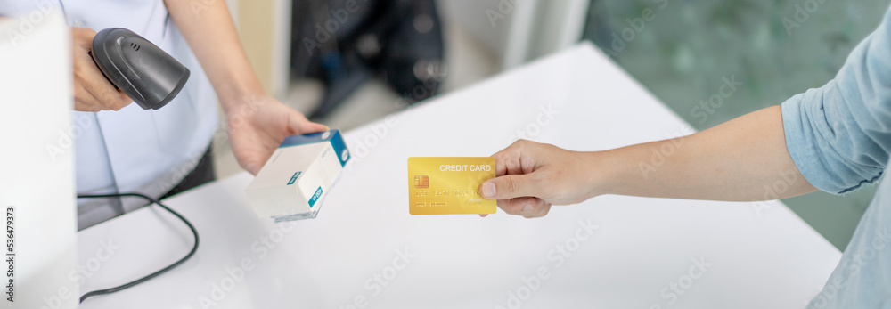 Credit card payment, Male patient pays by credit card to a pharmacist in a pharmacy, Get service at a community pharmacy , Pharmacist or cashier scanning medicinal products at checkout.