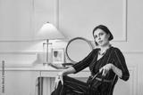 A stylish middle-aged woman in dark clothes is sitting on a chair in a retro-style room.
