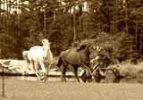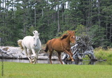 Arabian Horses, chestnut and white galloping on meadow along creek