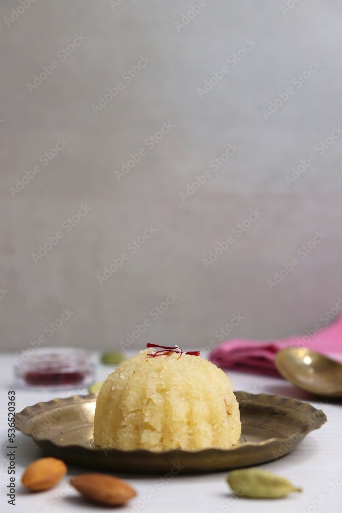 Rava Sheera or Suji ka halwa, shira is an indian sweet dish, made with semolina, sugar, ghee and dry fruits. served as dessert or as Prasad during festivals. Garnished with saffron. Copy space.