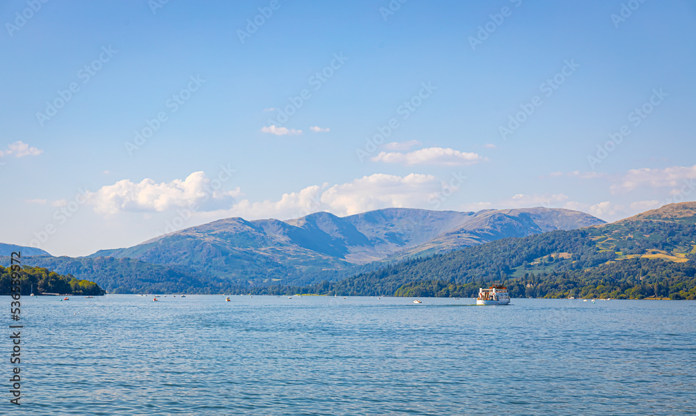 Wendermere lake near Bowness-on-Windermere in Lake District, a region and national park in Cumbria in northwest England