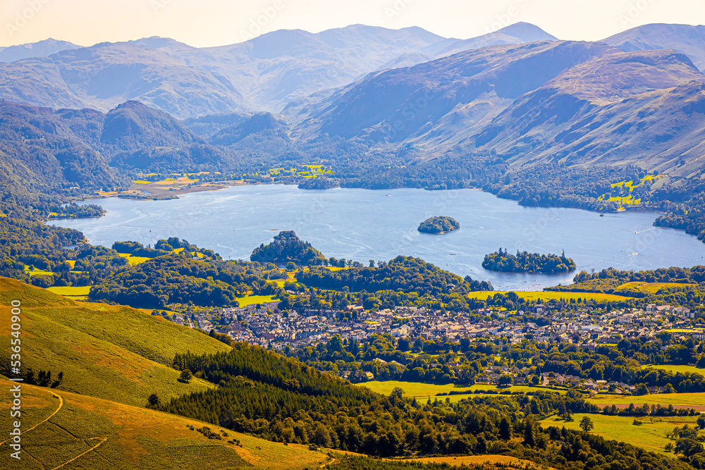 Aerial view of hills around Keswick in Lake District, a region and national park in Cumbria in northwest England