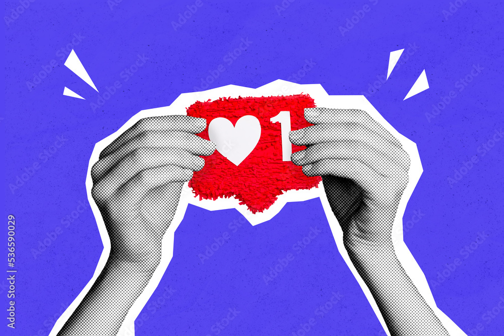 Creative photo 3d collage poster postcard artwork of two arm person blogger social media addiction concept isolated on drawing background