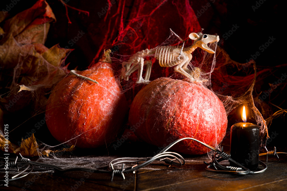halloween concept, pumpkin with bats on a dark background with a skeleton, web and black candle