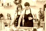 Young happy couple enjoying and preparing christmas cookies together in their kitchen.