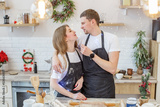 Young happy couple enjoying and preparing christmas cookies together in their kitchen.