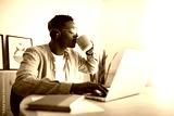 Young African American black man drinking coffee while listening to music and working with laptop. Working from home.