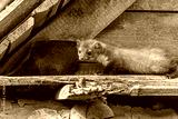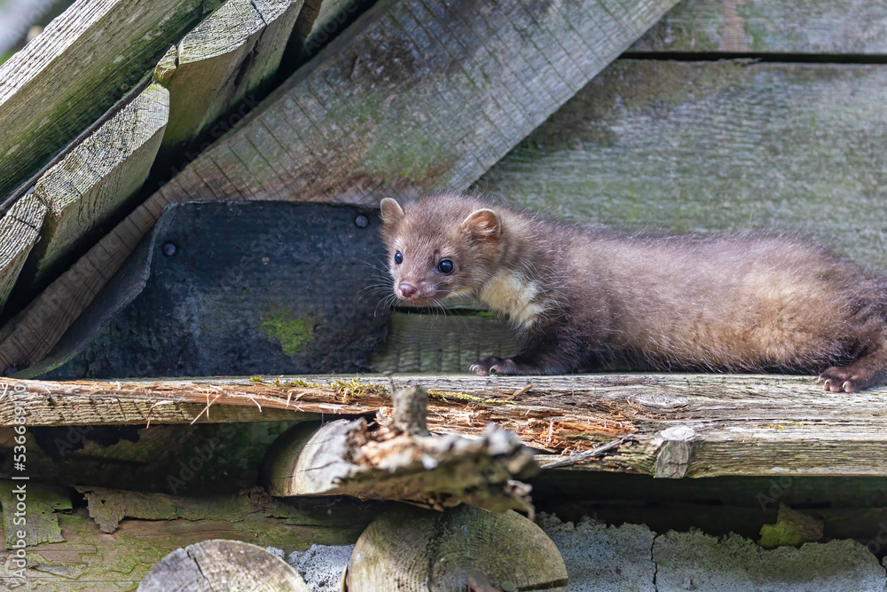 Young marten is posing in an old barn. Horizontally.