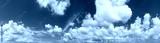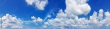 White cumulus clouds on clear blue sky background panorama, beautiful cloudscape wide panoramic view, cloudy skies backdrop, fluffy cloud texture, sunny summer day heaven landscape, cloudiness weather