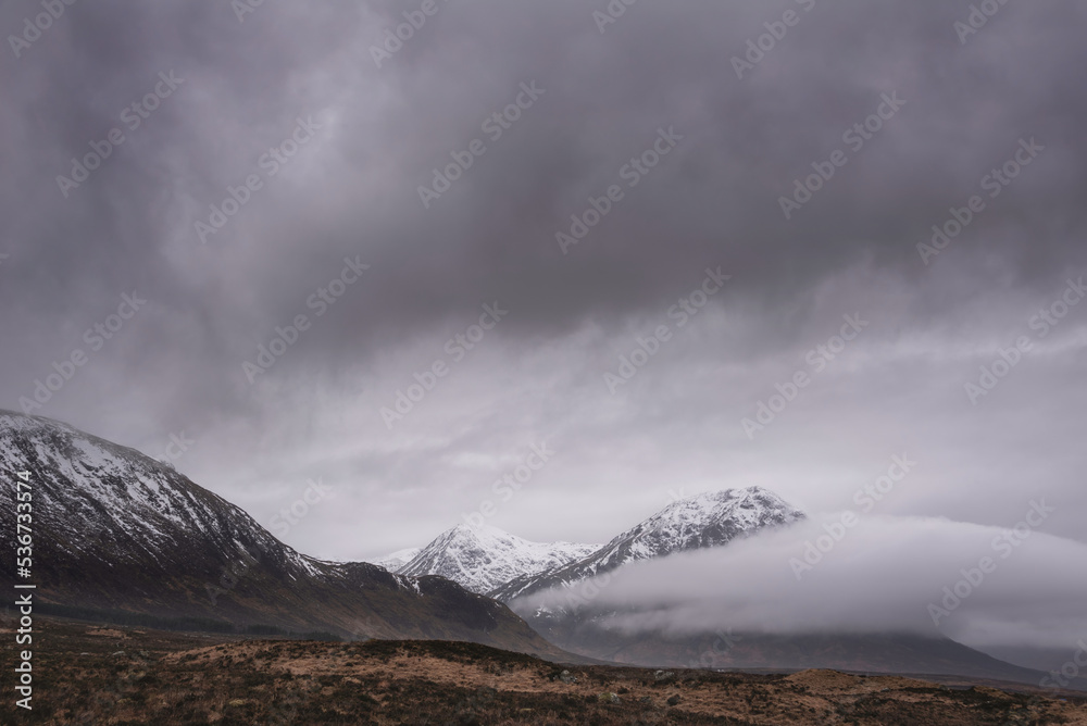 Beautiful Winter landscape of Buachaille Etive Mor Stob Dearg in Scottish Highlands engulfed in low cloud with snowcapped peaks