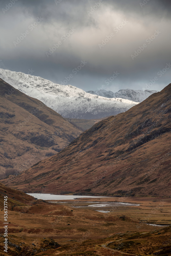 Stunning Winter landscape image of snowcapped Three Sisters mountain range in Glencoe Scottish Highands with dramatic sky
