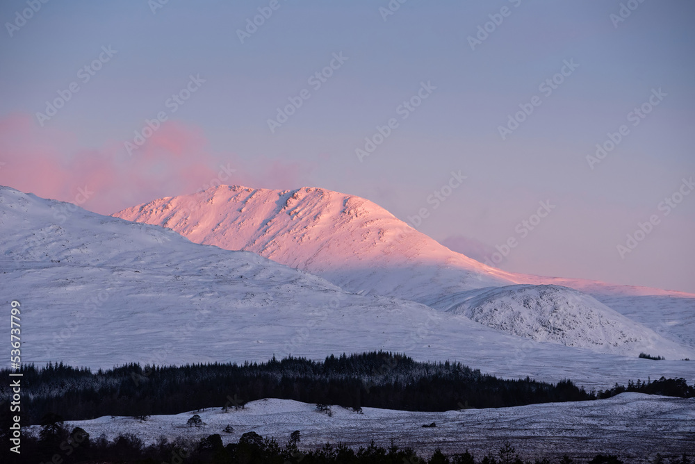 Majestic Alpen Glow hitting mountain peaks in Scottish Highlands during stunning Winter landscape sunrise