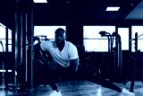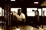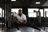 Muscular african man at the gym doing stretching exercises on the floor.