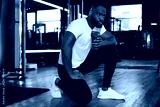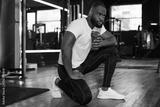 Sporty african man resting, having break drinking water after doing exercise.