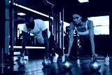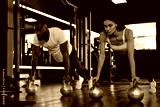 Sporty man and woman doing push-up in a gym.