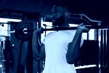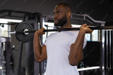 Fit and muscular african man lifting heavy barbell weight at the gym.
