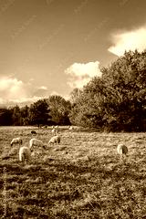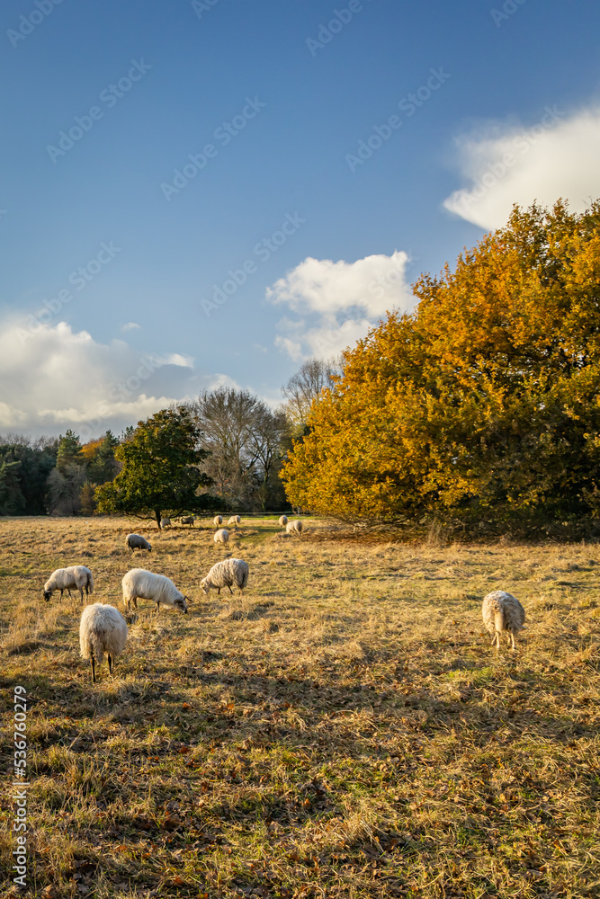 Flock of Landes sheep in a meadow on an Autumn day in southwest France