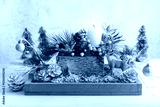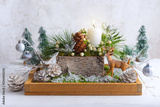 Christmas composition of candles, deer, pine cones, christmas baubles, fir branches, flowers, moss, winter berries in wooden box. Cozy home winter concept.