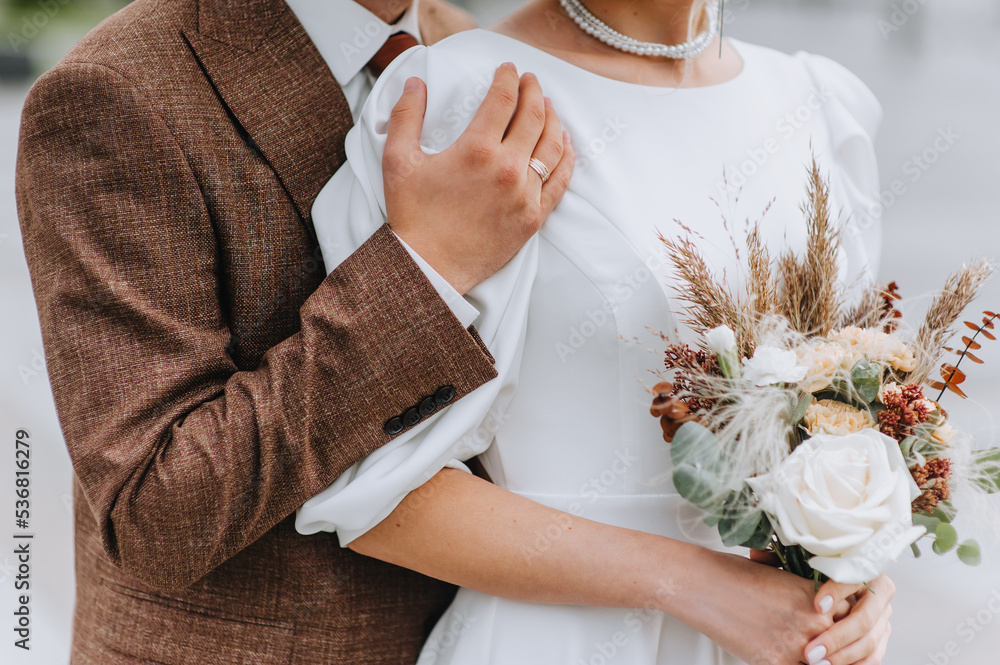 A stylish groom in a brown suit hugs a bride in a white dress with a bouquet of wild flowers. Wedding photography, portrait.