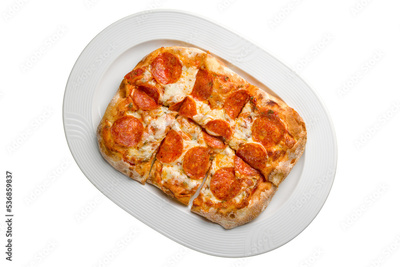Pepperoni pizza on Roman dough pinsa isolated on white background top view