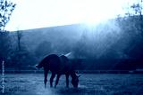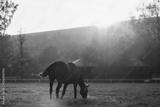 Horse grazing grass on pasture during sunset. Farm animal in autumn