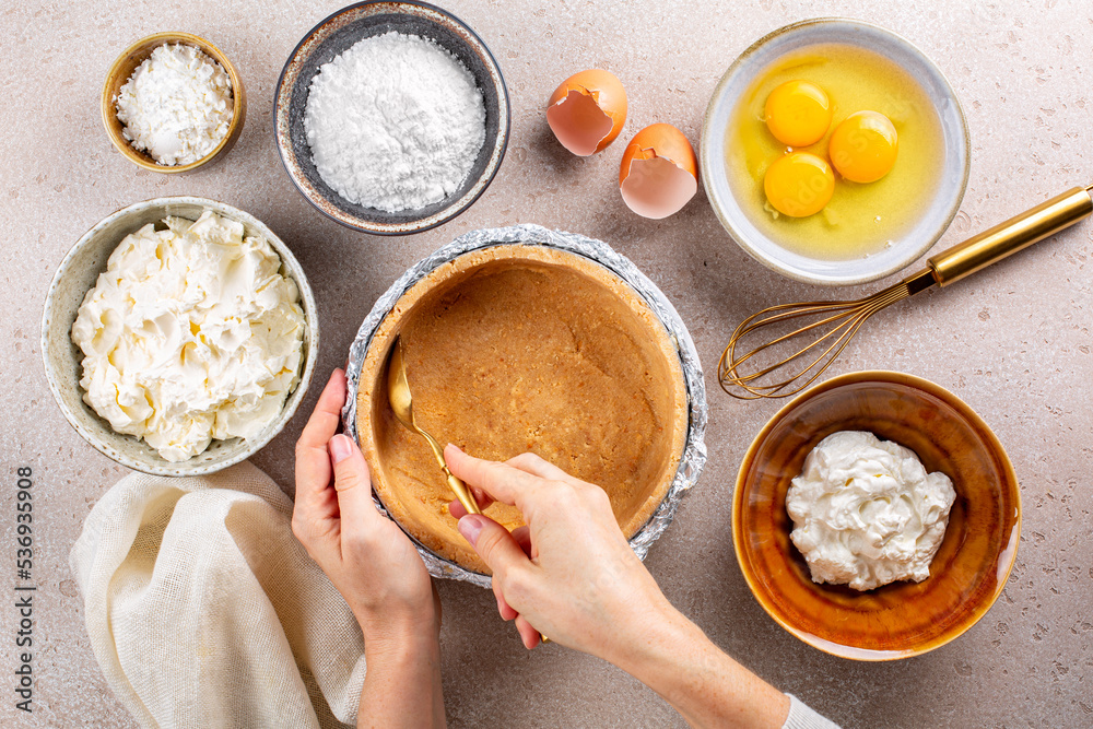 Cooking cheesecake, woman hands making a cake crust from crushed cookies and butter. Main ingredients: soft, fresh cream cheese, eggs, sugar powder, sour cream, corn starch. Top view.
