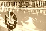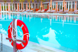 pool view with reflection and life ring at sunrise in the Maldives, the concept of luxury travel and safe vacation