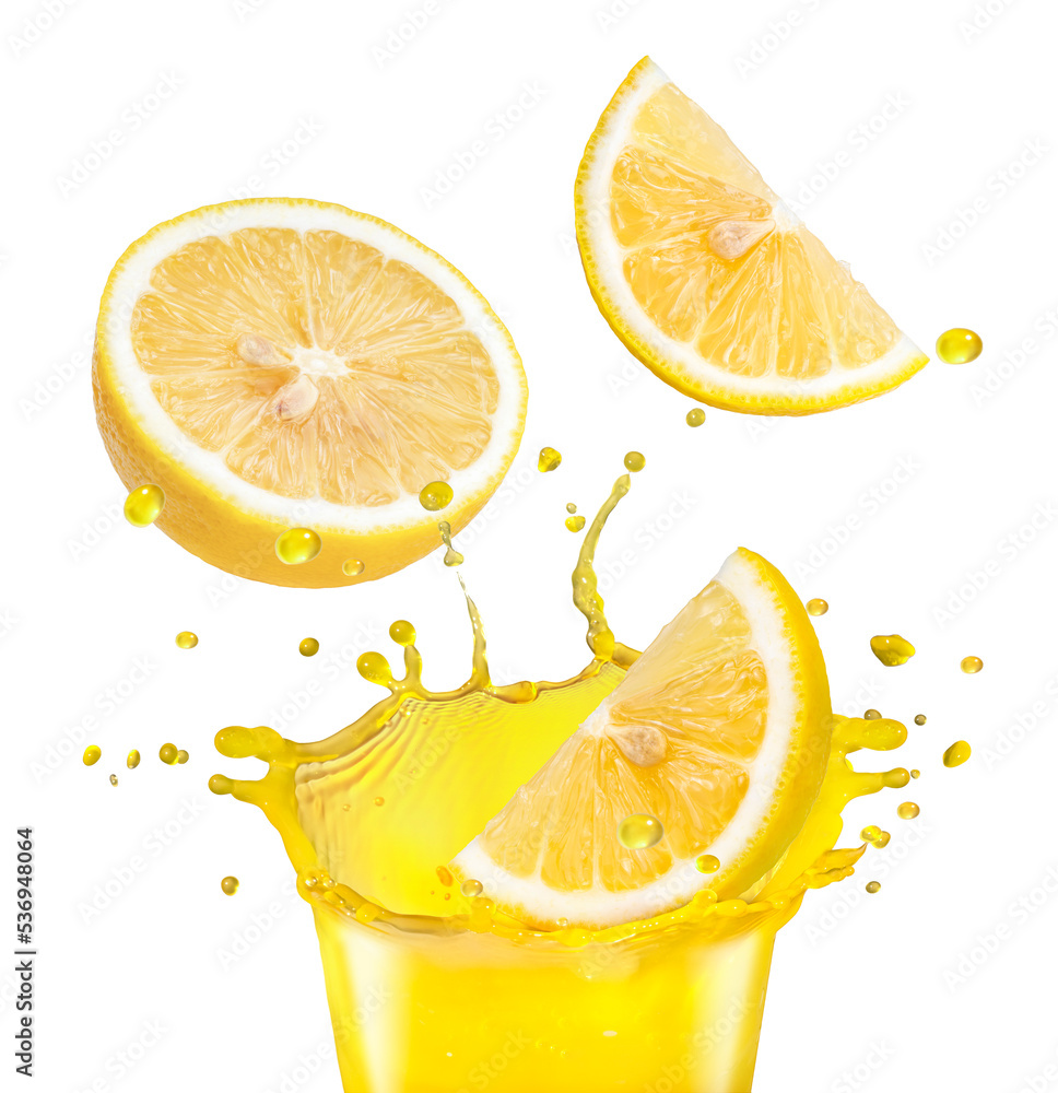 Fresh Lemon fruit falling into orange juices splashing on white background, With clipping path