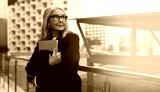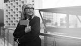 elderly business woman with a laptop in her hands against the backdrop of the office center