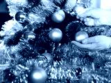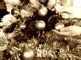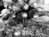 Female hands hang on a Christmas tree with a golden tinsel yellow ball. Congratulatory minimalistic.