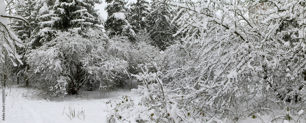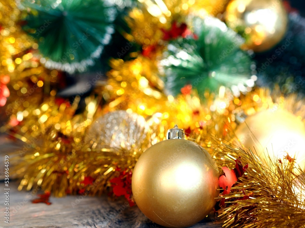 Christmas background with yellow tinsel and Christmas balls on a wooden table. Selective focus with blurred background. Congratulatory minimalistic background.