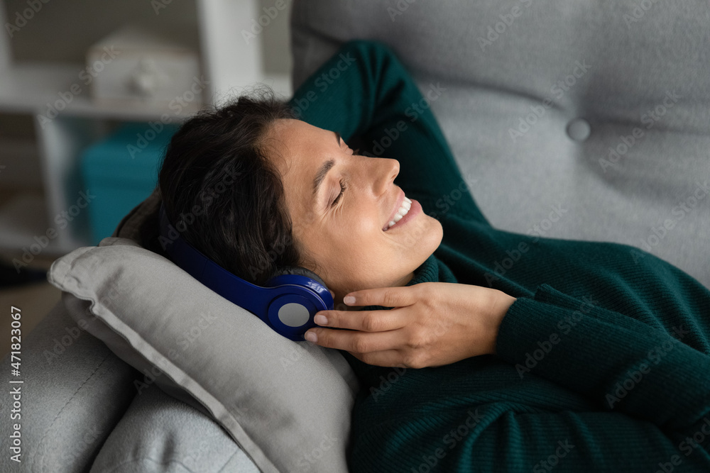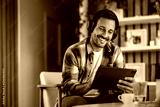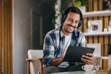 Happy man using a digital tablet, smiling and using headphones, listening to the music.