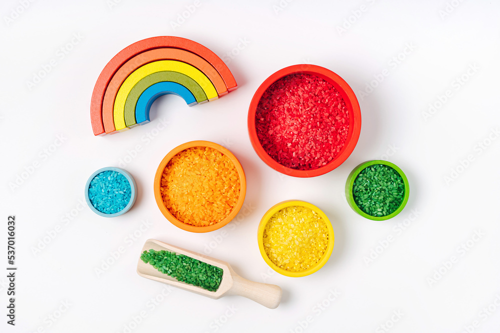 Bowls in rainbow colors with colored rice and scoops. Sensory bin toddler. Montessori material. Learning colors. Scooping and pouring activity for kids. Games for learning and development of child