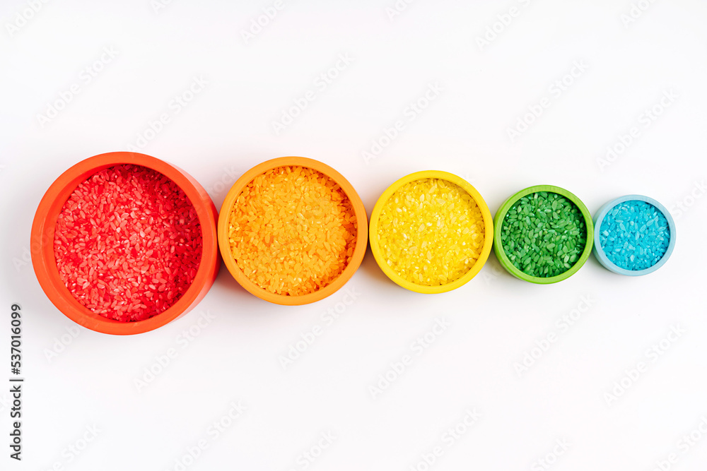 Bowls in rainbow colors with colored rice. Sensory bin toddler. Montessori material. Learning colors. Scooping and pouring activity for kids. Games for learning and development of child