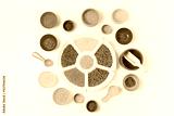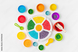 Play tray and bowls in rainbow colors with colored rice and scoops. Sensory bin toddler. Montessori material. Learning colors. Scooping and pouring activity for kids. Learning and development of child